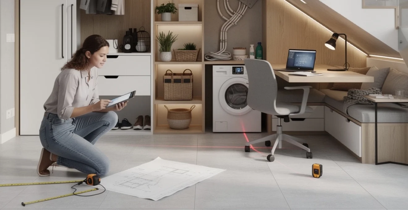 Pour optimiser ce type d’aménagement, organisez la hauteur utile : appareils en partie basse, plan de travail pour le pliage ou le tri, puis rangements fermés pour les lessives, produits et linge de maison. Une porte coulissante ou pliante permettra de dissimuler la buanderie lorsque vous ne l’utilisez pas, ce qui est appréciable si l’escalier se trouve dans une pièce de vie. Pensez également à des solutions anti-vibration et à une isolation phonique minimale pour éviter que le bruit des machines ne résonne dans la cage d’escalier.