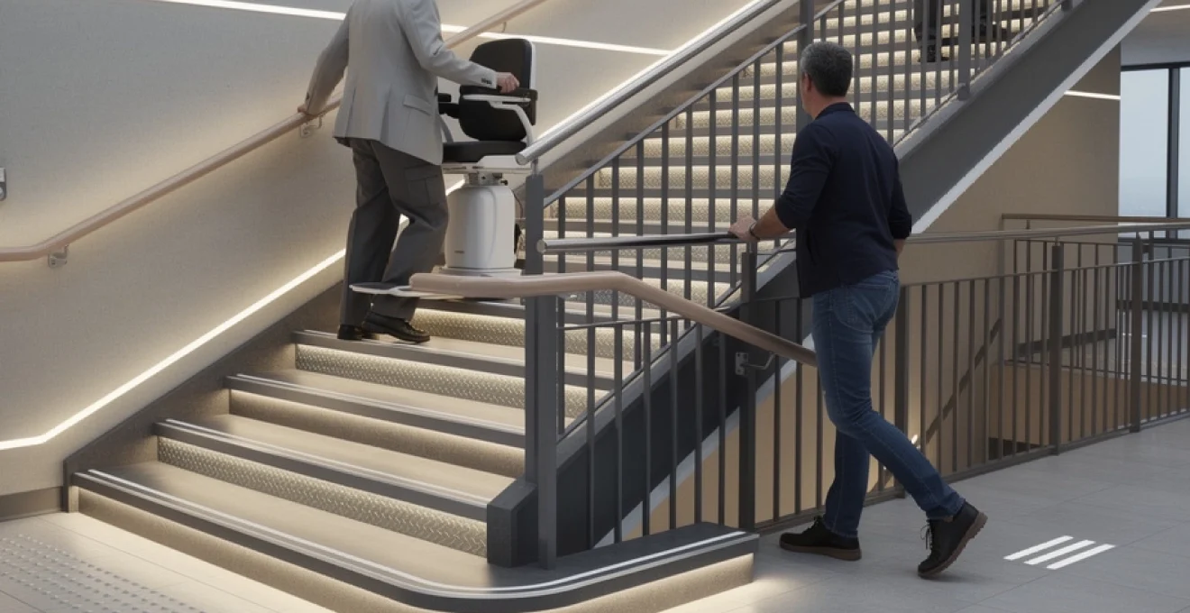 Sur le plan de la prévention des chutes, le monte-escalier supprime le risque lié à la montée ou à la descente pour les personnes les plus fragiles. Il agit un peu comme une « télécabine domestique », transférant la charge physique à la machine. Toutefois, son installation doit être pensée pour ne pas gêner le passage des autres usagers de l’escalier : largeur résiduelle, position en repli, encombrement aux paliers. Dans un immeuble collectif ou un ERP, ces contraintes deviennent déterminantes pour respecter les normes d’évacuation.