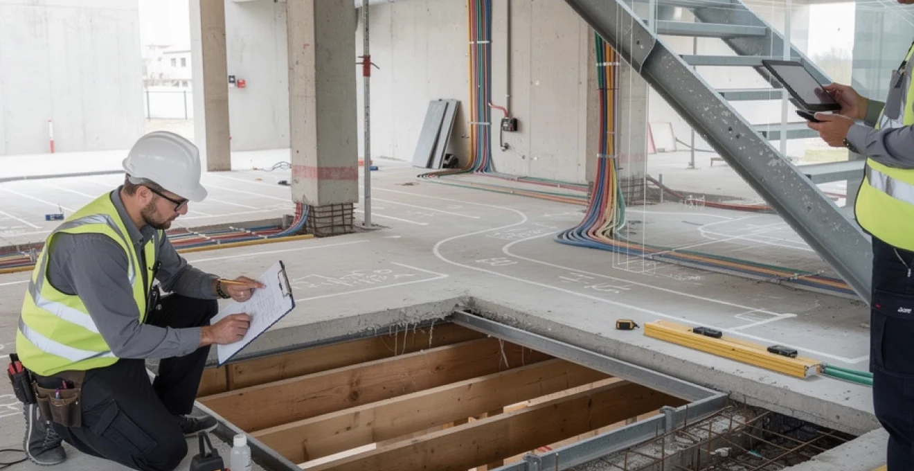 Avant tout percement de dalle pour une trémie d’escalier, vous devez réaliser un repérage exhaustif des réseaux existants. Cela commence par la consultation des plans d’exécution (électricité, plomberie, CVC) lorsqu’ils sont disponibles. En rénovation, ces plans sont souvent incomplets ou absents, et le recours à des technologies de détection s’impose : radars de sol, détecteurs électromagnétiques, caméras endoscopiques pour les faux-plafonds.