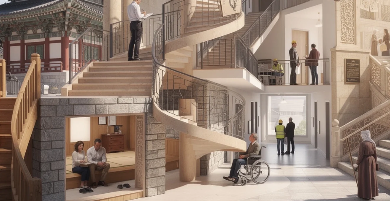 L’architecture coréenne traditionnelle des hanok développe une approche unique intégrant le système de chauffage au sol ondol. Les escaliers sont conçus pour minimiser les pertes thermiques tout en respectant les codes sociaux confucéens. Cette double contrainte génère des solutions architecturales originales, notamment des marches de hauteur variable selon le statut social des utilisateurs.