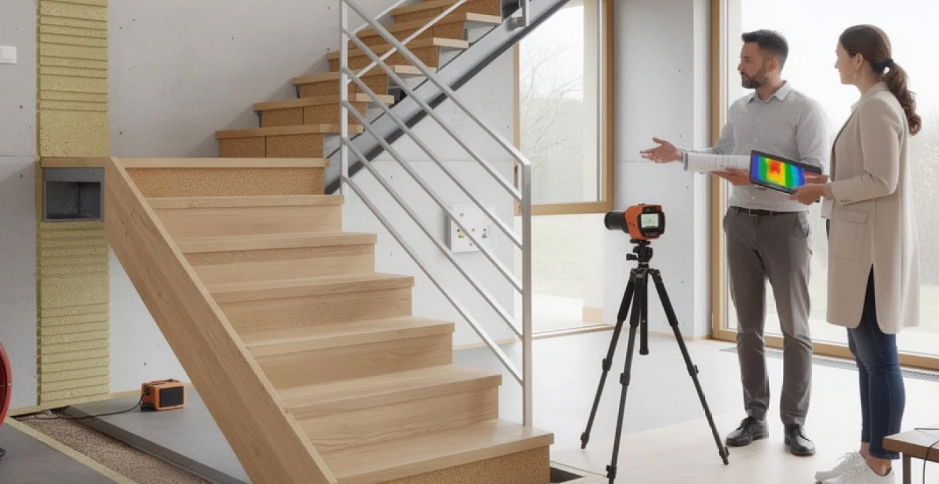 Chaque liaison plancher-escalier est un point sensible de l’enveloppe thermique. Dans une construction passive, on cherche à ce que la « bulle chaude » formée par l’isolation continue ne soit jamais traversée sans dispositif de rupture thermique. Un escalier mal ancré peut créer un « pont thermique en cascade » : la chaleur s’échappe par le plancher, transite par les fixations métalliques de l’escalier, puis se dissipe dans des parois plus froides.